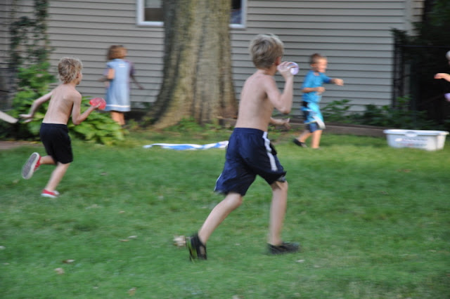 If you're a fan of the comic, you know Calvin loves his water balloons. We didn't drop them from trees onto Suzy, instead we had a good ol' fashioned water balloon fight. We filled a lot of water balloons. I personally filled about 450. My father in law contributed 200. So 650 water balloons! We distributed them around the yard in various plastic containers. When I said GO, the kids went at it and got completely soaked. I know my boys loved it. All those balloons were popped within about 8 minutes! After they were gone I had several pleading faces looking up at me...... "do you have any more???" It was great.